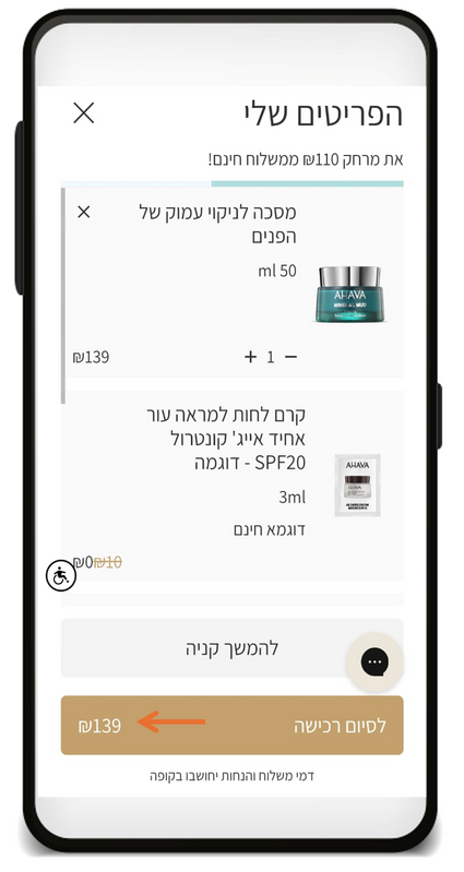 כשתסיימי, לחצי על האייקון של העגלה בחלק השמאלי העליון של המסך ובחרי "לסיום רכישה".