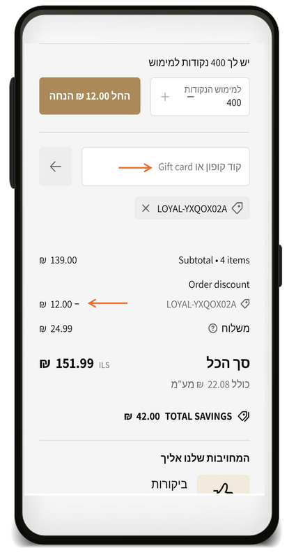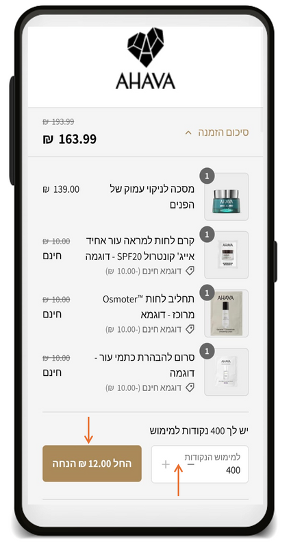 - עבור הנחות על הזמנות: לאחר שבחרת את המוצרים שתרצי לרכוש, עברי לעמוד התשלום, בו תוכלי לבחור כמה נקודות תרצי לממש בהזמנה הנוכחית, וכן כמה יהיה שווי ההנחה.